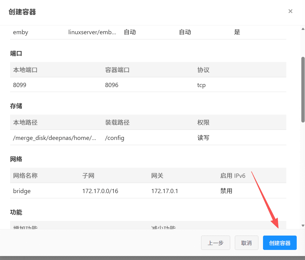 1.9 设置完成后,一直下一步,最后点击“创建容器”