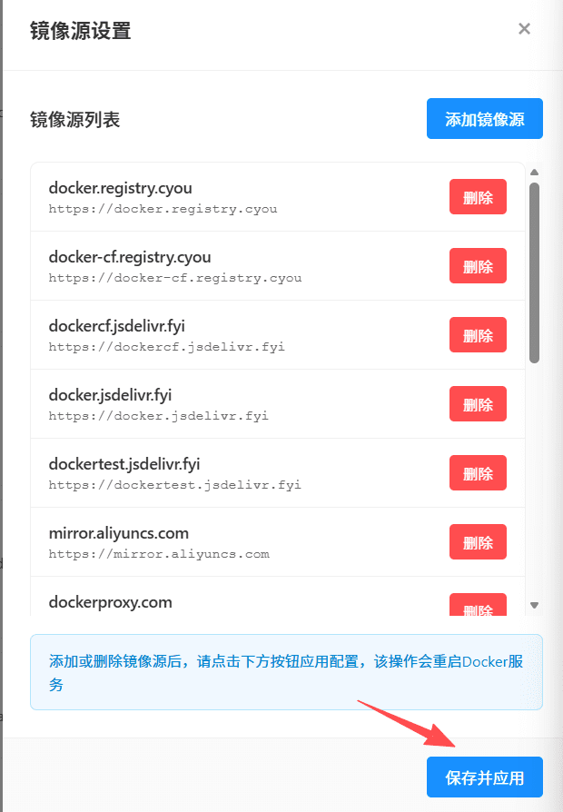 点击“镜像仓库”-“镜像源设置”,在弹出的镜像源设置页面,用户可添加镜像源地址