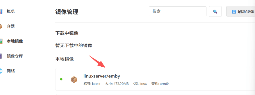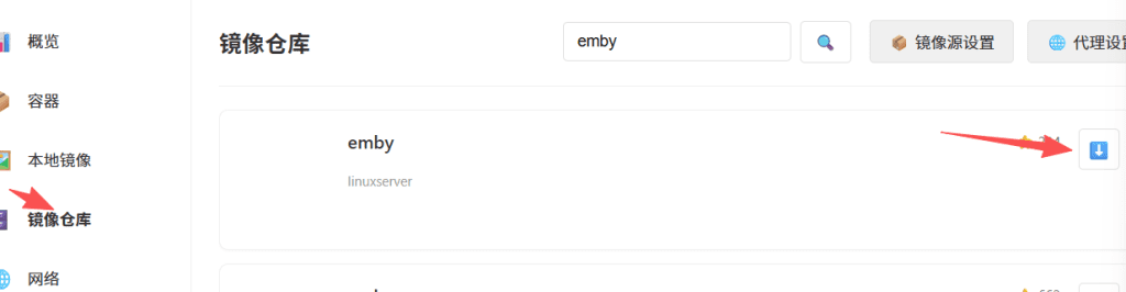 点击“镜像源仓库”,进入镜像仓库页面,可在搜索栏中搜索需要下载的镜像名,如emby,搜索到点击“下载”